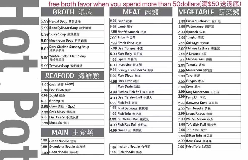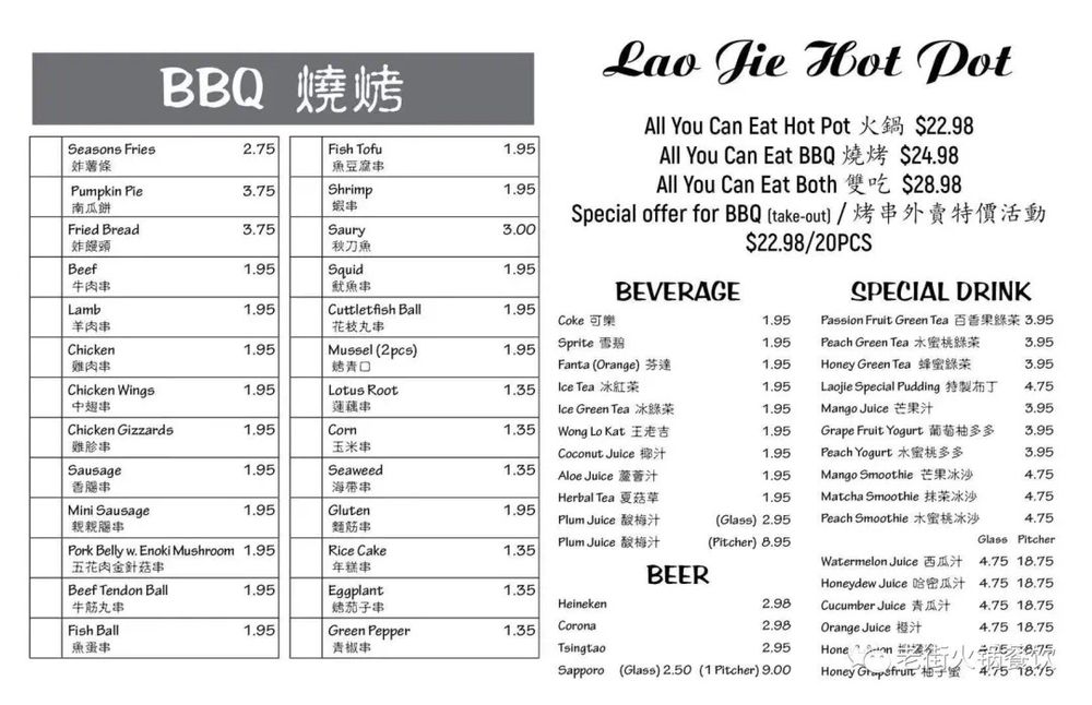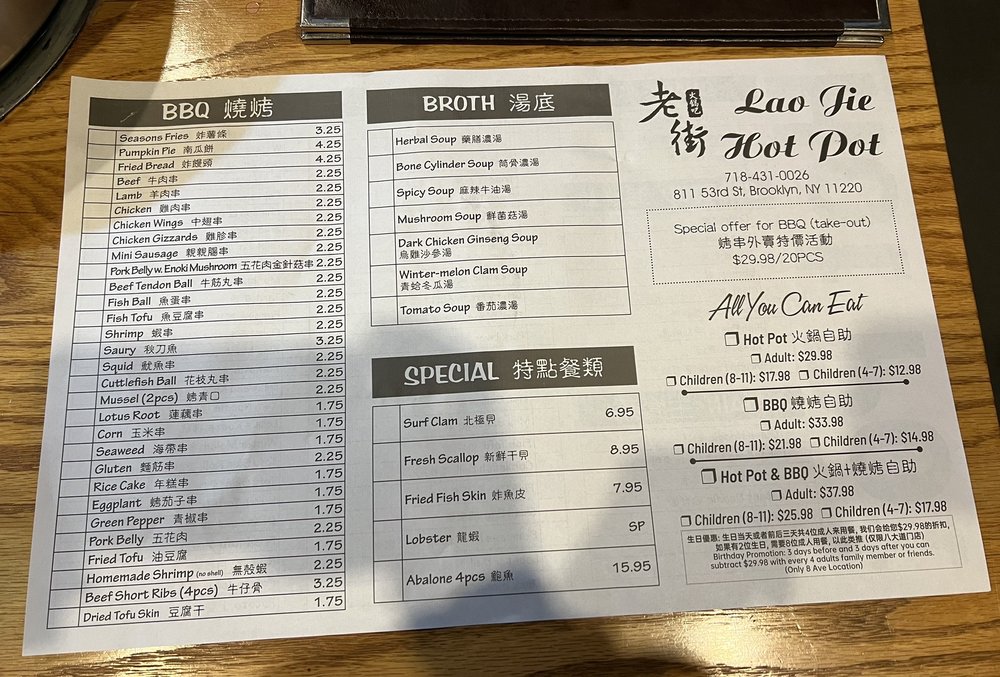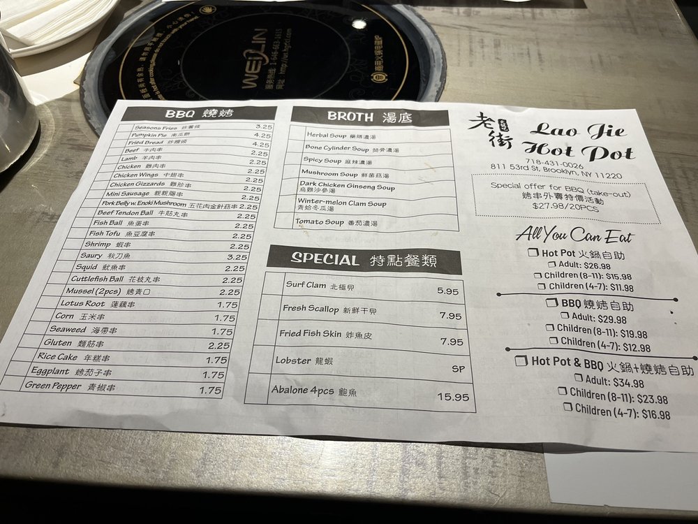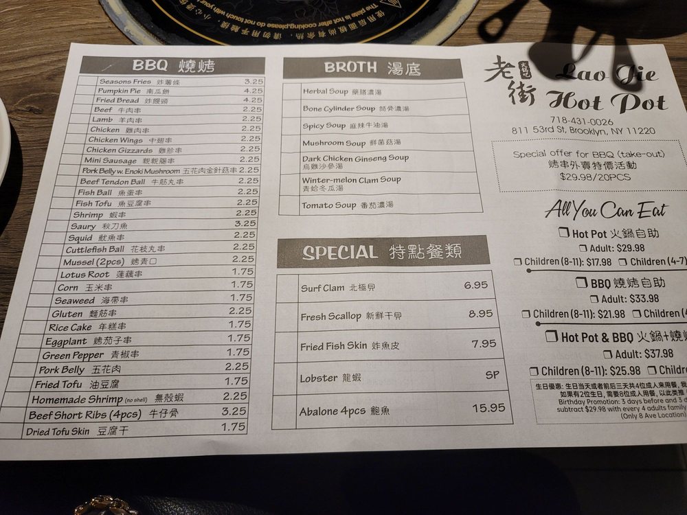 Introducing Laojie Hotpot, a trendy and casual restaurant in Brooklyn offering a unique hotpot and Chinese bbq dining experience. With a wide array of vegetarian and vegan options, Laojie Hotpot is perfect for groups and families looking for a budget-friendly meal. Customers rave about the fresh and flavorful ingredients, including thinly cut meats, seafood, and various veggies. The attentive wait staff, vibrant ambiance, and the option to add cooked skewers to the all-you-can-eat hotpot mix make for a memorable dining experience. Don't miss out on the indulgent hotpot and grill extravaganza at Laojie Hotpot, where the tantalizing aroma of savory spices and meats will leave you craving for more. Treat yourself to a party of flavors and spices in your mouth at Laojie Hotpot, a must-visit culinary haven in Brooklyn.